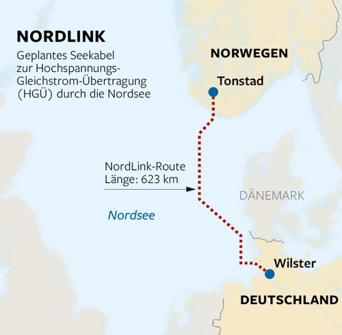 NordLink是首個銜接德國和挪威電網的互聯體系,被視為可再生動力交流的高度互補,由于德國的風能和太陽能發電場以及挪威的水力發電廠能夠作為德國進口動力的“動力庫”。