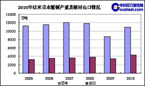 日本鋼鐵行業在全球鋼鐵行業有著世界舉足輕重地位,產量僅次于中國,位列全球第二。 日本鋼材出口占其產量比重較大,2010年出口4340萬噸,占比接近40%,較2005年上升約10個百分點。